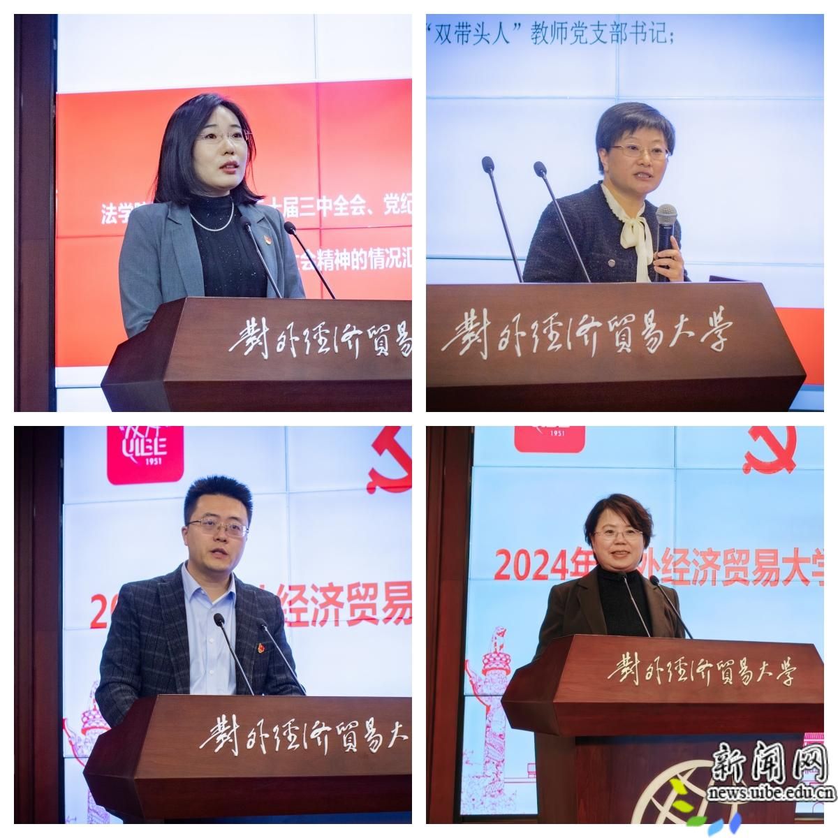 法学院张欣教授、国际经济贸易学院陈志鸿教授、中国金融学院宫迪教授、保险学院游桂云教授作为二级纪检委员代表,分别介绍了各自单位学习贯彻落实党的二十届三中全会和全国教育大会精神的情况,分享了所在单位的具体做法和取得的成效。纪委办/监察处副处长邓磊解读了学校党委《关于开展学习贯彻党的二十届三中全会和全国教育大会精神专项督导工作的实施方案》相关要求。
