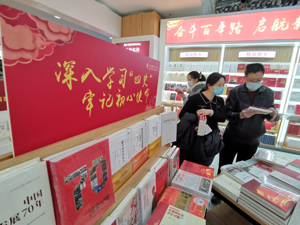 在全党开展党史学习教育,是牢记初心使命、推进中华民族伟大复兴历史伟业的必然要求。图为2021年3月6日,北京图书大厦等大型书店及各新华书店门店陆续上新《中国共产党简史》等主题出版物,引起读者的关注和阅读。(图片来源:人民视觉)