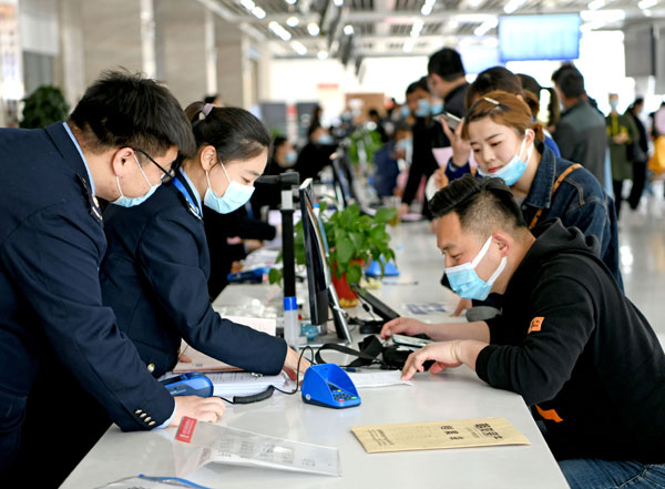 国家税务总局淮南市税务局以党史学习教育为契机,开展便民办税春风行动。图为4月9日,淮南市税务局第二税务分局工作人员在该市政务服务中心为群众提供“一站式”办税服务。(图片来源:人民视觉)